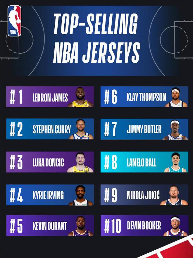 NBA中国公布常规赛球衣销量:詹姆斯、库里、东契奇分列前三